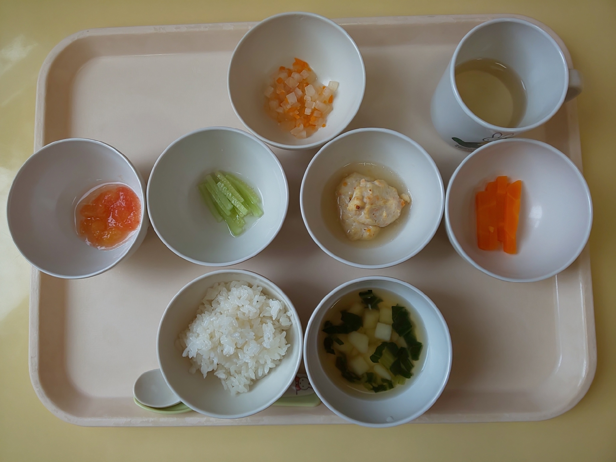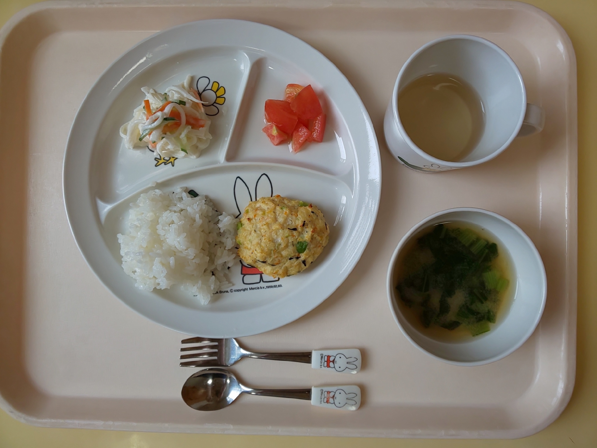メニュー:ご飯・小松菜とじゃが芋の味噌汁・豆腐ハンバーグ・大根サラダ・トマト・麦茶